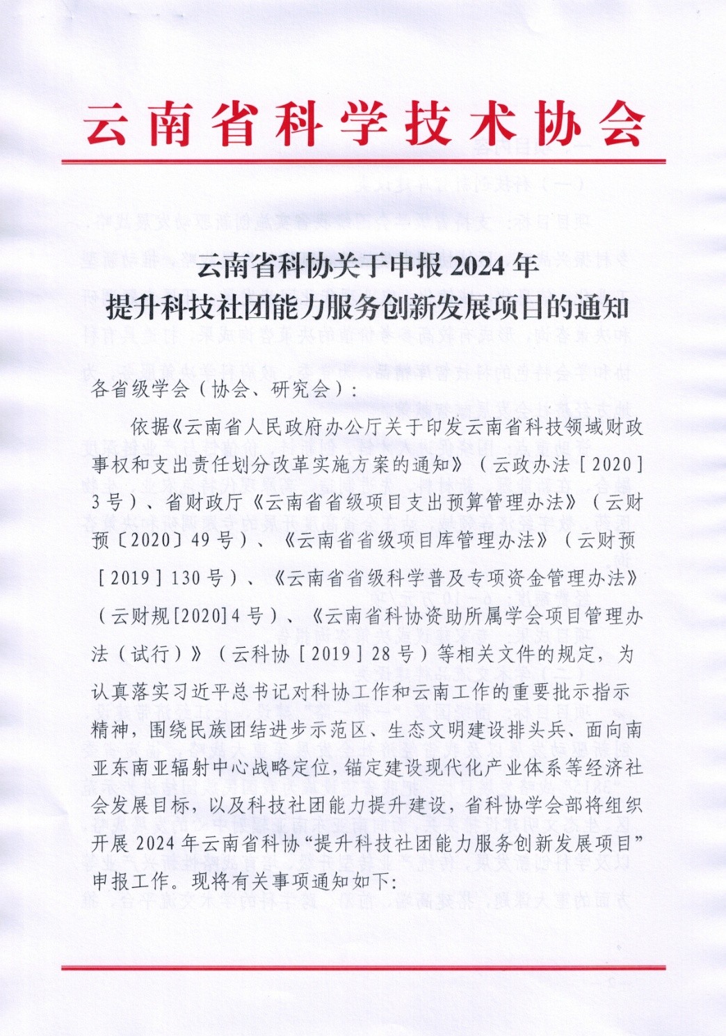云南省科协关于申报2024年提升科技社团能力服务创新发展项目的通知
